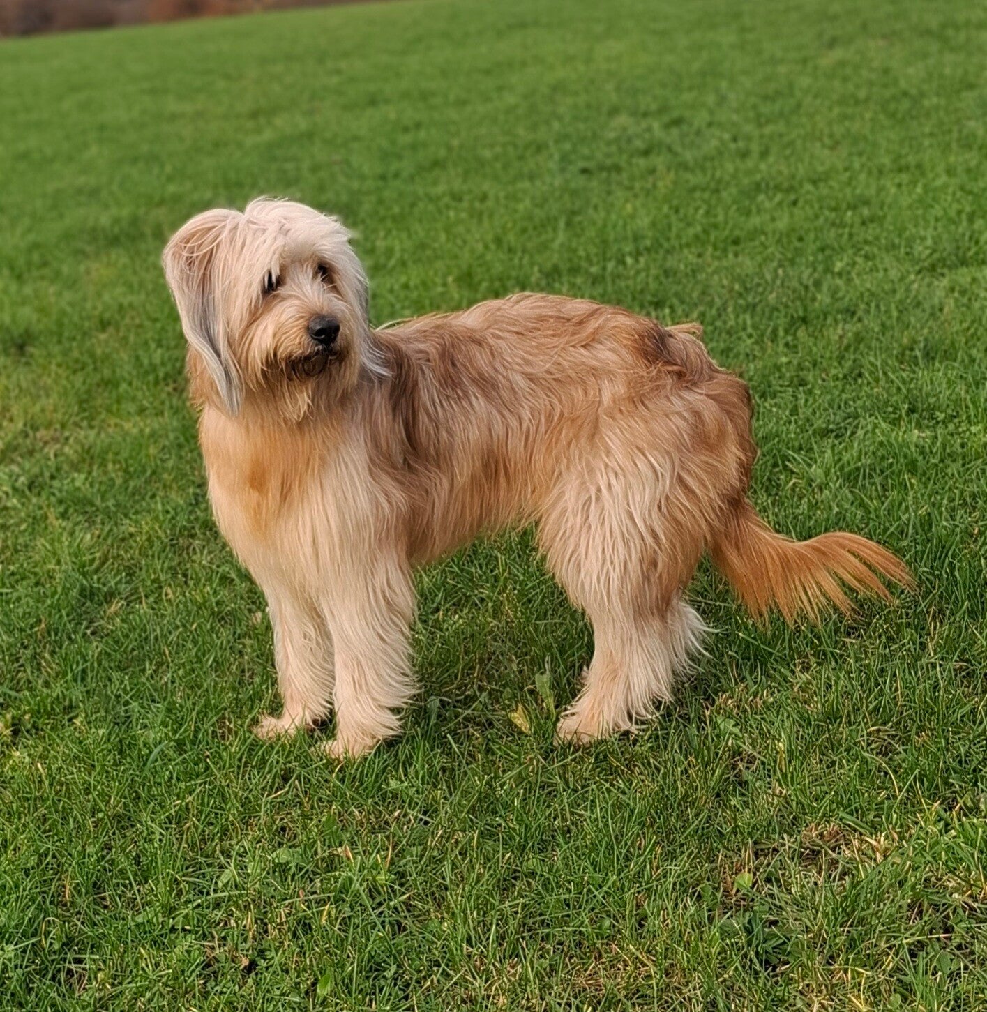Fellfarbe: braun (merle-Träger) mit weißen Abzeichen